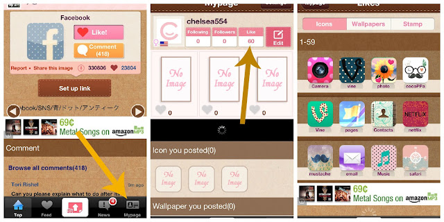 It looks kind of like the Apple app store. It has a couple categories to scroll through on the main screen, such as popular icons, new icons, etc. You can also search different categories. I liked the app icons category but I found some good ones in many different categories. At the bottom it has different buttons. The one you should note is the "Mypage" button...you will want to know where this is for later because you are going to build an icon library by "liking" images. I went through and found a bunch of different images, liked them and then had easy access to them later.